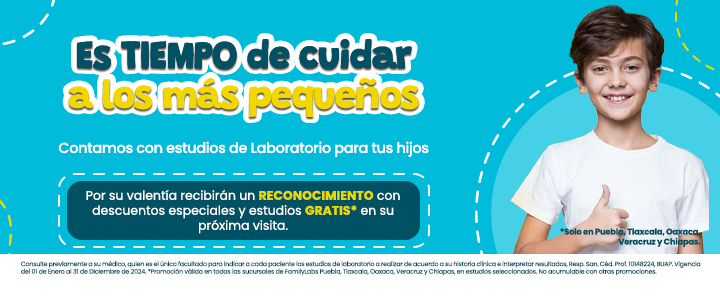Consulte previamente a su médico, quién es el único facultado para indicar a cada paciente los estudios de laboratorio a realizar de acuerdo a su historia clínica e interpretar resultados, Resp. San. Céd. Prof. 10148224, BUAP. Vigencia hasta el 31 de diciembre de 2024. No acumulable en otras promociones. Promoción válida en todas las sucursales de FamilyLabs Puebla, Tlaxcala, Oaxaca, Veracruz y Chiapas en estudios seleccionados.